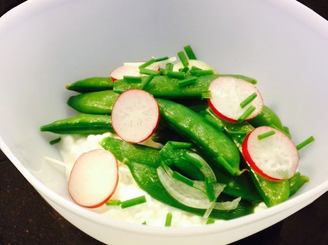 Knackerbsen, Radieschen in Scheiben, Bundzwiebeln und Schnittlauch darauf anrichten